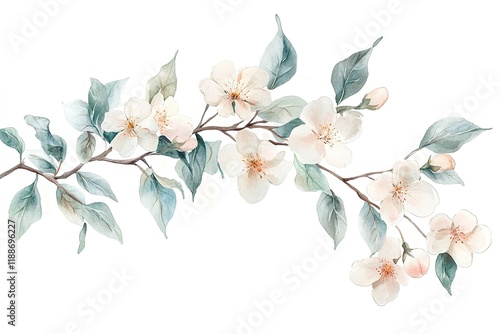 Elegant Watercolor Floral Branch: Delicate Blooms, Soft Hues, Botanical Art, Spring Decor, Wedding Invitation Design,