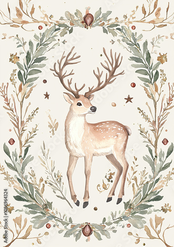 Elegant Watercolor Illustration of a Christmas Deer in a Festive Wreath Design