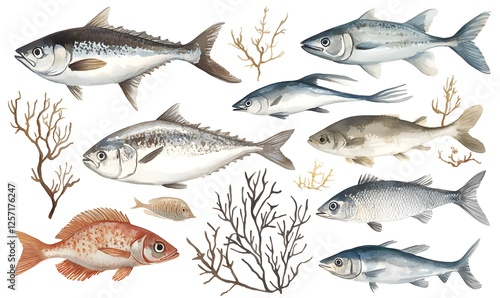 fish, food, isolated, fresh, white, raw, seafood, animal, fishing, sea, mackerel, healthy, bream, fin, tail, carp, silver, trout, catch, head, fresh water, ingredient, meal, nature, salmon, white background, freshness, river, scale, meat, water, cooking