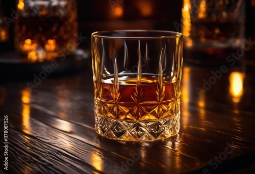 elegant whiskey glass dark wooden table highlighting sophisticated reflection rich textures warm tones, barware, drinkware, beverage, cocktail, liquor