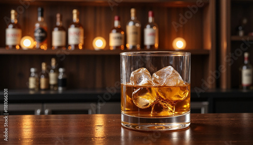 Elegant whiskey on the rocks at bar counter, sophisticated ambiance