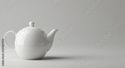 Elegant White Ceramic Teapot with Lid on the Left Side Against a Grey Background with Room for Text on the Right