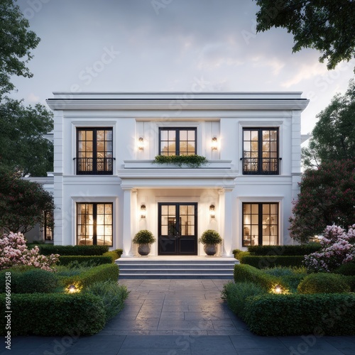 home, house, luxury home, white, colonial, classic, elegant, modern, architecture, exterior, property, luxury, front, facades, door, window, garden, landscaping, tree, flower, shrub, balcony, lighting, twilight, evening, calm, peaceful, stylish, grand, impressive, light, dark, black, detail, design, craftsmanship, realism, rendering, residence, estate, front view, beautiful, stunning, dream, charming, imposing