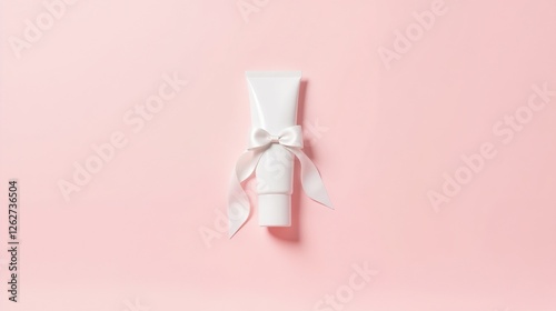 Elegant white cosmetic tube adorned with a ribbon against a soft pink background
