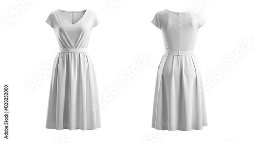 white, dress, fashion, clothing, elegant, female, apparel, design, template, garment, front, back, view, plain, background, stylish, classic, simple, chic, cap, sleeve, waist, flowing, skirt, fabric, realistic, seamless, presentation, three-dimensional, render, isolated, transparent