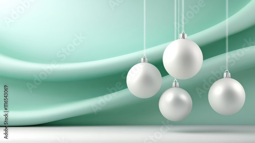 Elegant white ornaments hang against a soft teal background, evoking a serene holiday mood, AI