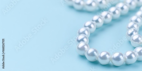 Elegant white pearl necklace gracefully arranged on a soft blue background, showcasing the luster and beauty of the pearls, perfect for jewelry and fashion concepts