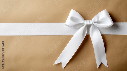 Elegant white ribbon and bow on a textured kraft paper background, gift wrapping detail