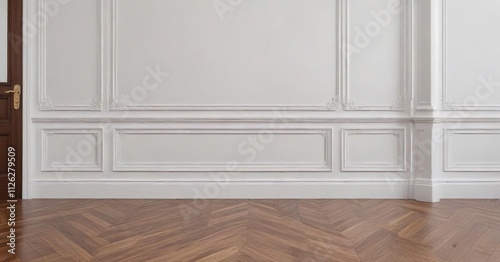Elegant white wall with intricate classic style moulding and glossy wooden floors, white, wooden, wall
