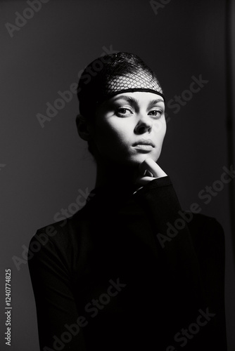 Elegant woman in black attire with fishnet headband, posing thoughtfully against a dark background. Fashion and beauty concept with dramatic lighting.