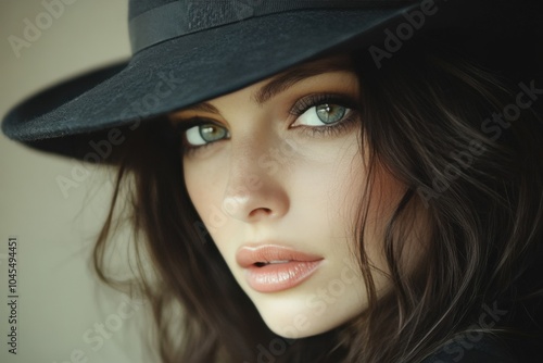 portrait, woman, beauty, hat, closeup, fashion, elegance, make-up, brown hair, model, chic, stylish, emotional, intimate, photo, lifestyle, confidence, artistic, feminine, serene, captivating, glamour, haute couture, texture, coiffure, black hat, natural light, fashion model, moody