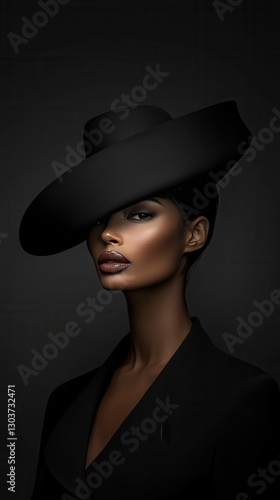 fashion, elegance, style, woman, beauty, black hat, portrait, dark background, glamour, haute couture, sophisticated, chic, model, runway, sewing, classic, graceful, refined, mystery, alluring, cosmetic, make-up, sleek, pose, studio shot, shadow, confident, modern, timeless, minimalist, luxurious, stunning, stylish, head shot, dark, shadow, shade, evening, facial expression, dark skin, closeup, artistic, creative, aesthetic, studio