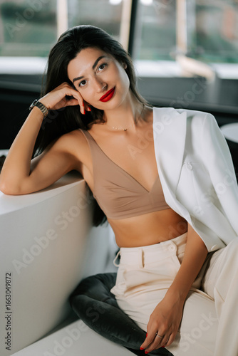Elegant woman in stylish outfit relaxing on a yacht in a vibrant setting
