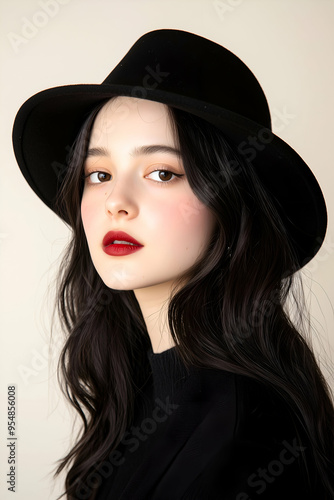 Elegant woman with dark wavy hair and bold red lipstick