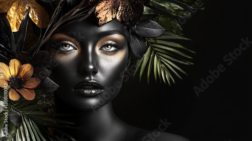 woman, portrait, gold, floral, headpiece, moody, elegant, beauty, artistic, dark
