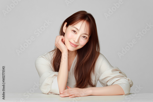 woman, smile, beauty, portrait, young, natural, female, happy, long hair, attractive, elegant, soft light, model, healthy, closeup, face, lifestyle, studio, fashion, minimal, fresh, skin, charming, relaxed, positive, friendly, confidence, modern, inspiration, simple, white shirt, gentle, beauty care, clean, smiling, glamour, happiness, thinking, business