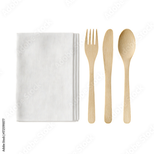 Elegant wooden cutlery set and white textured napkin mockup for food presentation isolated on transparent background