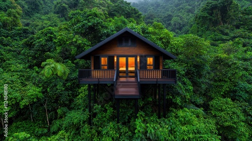 Elegant Wooden House Elevated Amidst Lush Green Jungle Landscape with Warm Glow