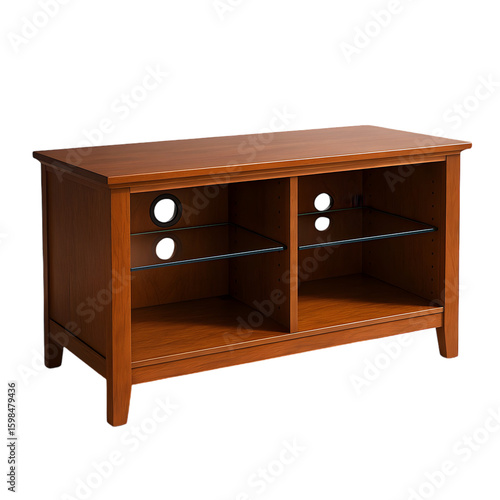 Elegant wooden TV stand with glass shelves, perfect for modern living rooms or entertainment spaces.