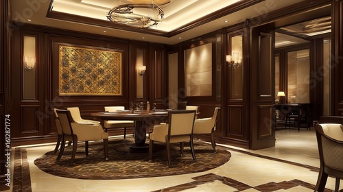 room, interior, dining, table, chair, wood, panel, luxury, elegant, round, artwork, lighting, warm, gold, decor, furniture, design, classic, style, ambience, sophistication, meeting, formal, gathering, space, arrangement, light, shade, brown, cream, beige, mirror, floor, ceiling, structure, embellishment, texture, detail, perspective, architecture