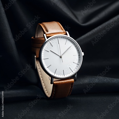Elegant wristwatch with a minimalist design, showcasing its sleek features against a dark backdrop