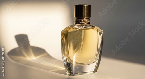Elegant Yellow Liquid in Glass Bottle with Golden Cap Casting Shadow