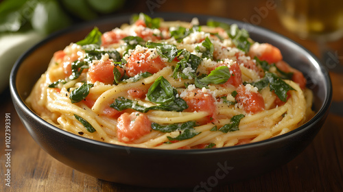 Elegantly Crafted Tomato Basil Ricotta Pasta with Spinach and Freshly Torn Basil Leaves