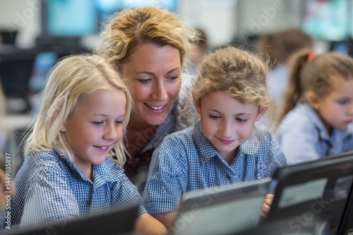 elementary school, teacher, classroom, education, learning, children, student, computer, technology, school, indoor, smiling, tutoring, assistance, childhood, girl, blonde hair, sharpened, closeup, portrait, desk, screen, monitor, study, cognition, collaboration, teaching, academic, pedagogy, elementary school, bright, cheerful