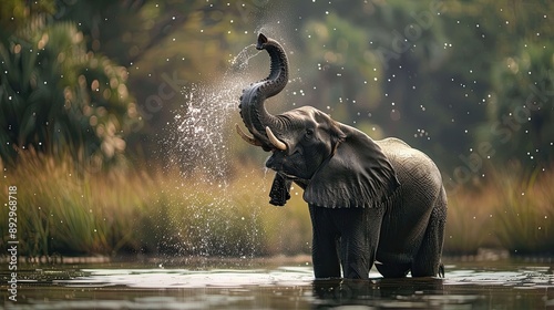 elephant joyously sprays water with its trunk cooling off lush river habitat
