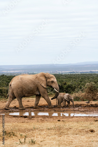 elephant, calf, african elephant, waterhole, savanna, wildlife, nature, africa, mother, baby, mammal, walking, conservation, mud, wild, large animal, herbivore, tusk, trunk, outdoors, ecosystem, protective, bond, parenting, safari, gentle, south africa, serene, peaceful, tranquil, pachyderm, survival, endangered, biodiversity, wilderness, majestic, nurturing