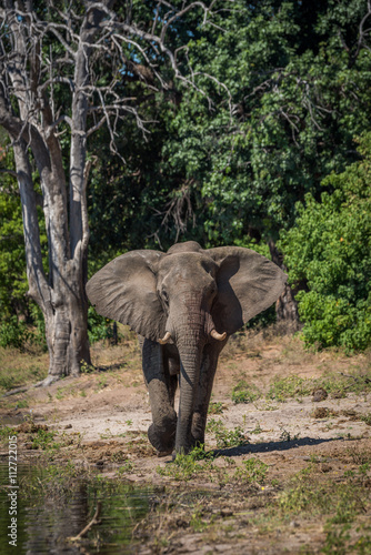 Elephant walking along wooded riverbank in sunshine