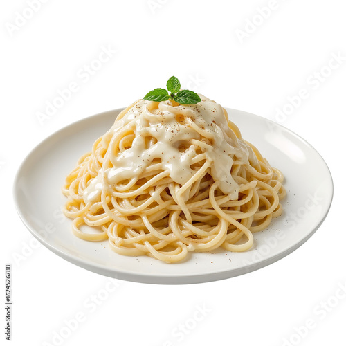 spaghetti, pasta, creamy, sauce, mint, garnish, plate, food, meal, dish, culinary, delicious, epicure, italian, eatery, lunch, dinner, white, background, transparent, serving, cookery, cooked, fresh, tasty, tradition, basil, isolated, nobody, nourishment, gastronomy, appetising, strand, classic, eatable