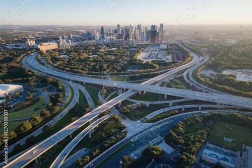 highway, interchange, expressway, overpass, road, traffic, city, urban, city landscape, skyline, building, skyscraper, infrastructure, transportation, aerial view, elevated, landscape, tree, green, nature, travel, modern, engineering, construction, concrete, steel, sunrise, sunset, morning, evening, light, sunlight, distance, perspective, design, development, mobility, journey, route, path, destination, car, vehicle, environment