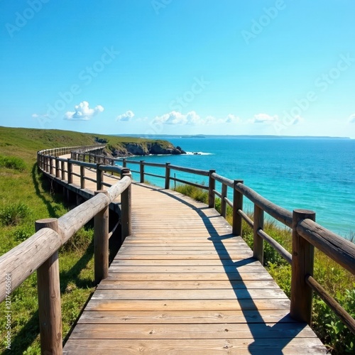 Elevated wooden walkway, panoramic North Sea view, sand, panorama