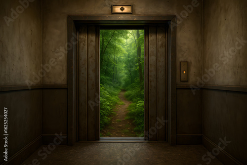 elevator, forest, wilderness, path, nature, escape, freedom, journey, adventure, surreal, discovery, exploration, wild, outdoors, tree, timberland, greenery, scenic, view, landscape, travel, environment, trail, door, vegetation, sunlight, tree, light, perspective, pathway, destination, calmness, growth, natural, calm, fresh air, peaceful, beautiful, harmony, mysterious, unexpected, imaginative, inspiring, creative, imagination, metaphor, transformation