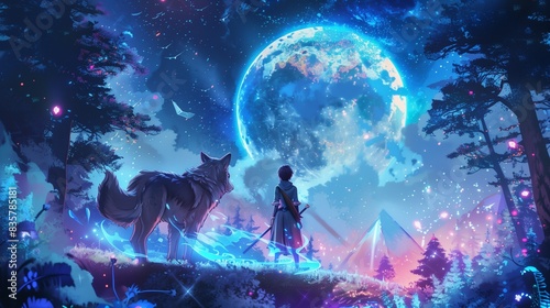Elf ranger and wolf companion in enchanted anime forest