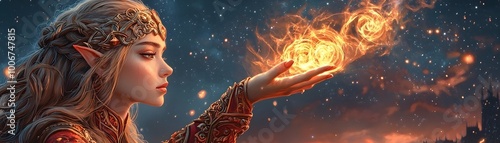 elf, woman, female, magical, magic, fire, flames, fantasy, mystical, aethereal, glowing, power, energy, star, night, sky, beautiful, enchanting, spell, sorceress, sorcerer, magician, powerful, celestial, cosmic, supernatural, fairy tale, dream, fantasy art, digital artwork, illustration, artwork