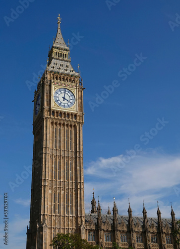 Elizabeth Tower, known as Big Ben, rising above the Houses of Parliament in London, UK.