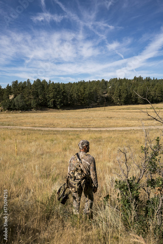 tree, sunlight, standing, quiver, person, outdoors, morning, hunting, hunter, forest, elk, colorado, camouflage, binocular, big game, balaclava, arrow, archery, archer, caucasian, male, people, adult, adult, 50s, grown-up, middle-aged