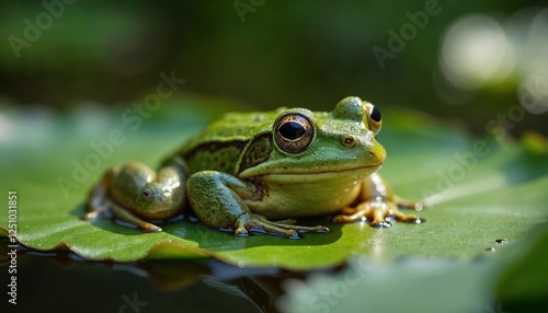 Emerald amphibian contemplates its watery domain on a lily pad stage