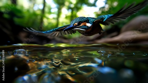 kingfisher, flight, stream, water, nature, wildlife, bird, emerald, blue, colourful, vibrant, wing, forest, tree, underwater, rock, bubble, rapid, swift, motion, sharp, sharpened, detail, environment, fresh water, habitat, conservation, photo, beauty, macro, animal, ecology, fauna, aerial, view, moment, capture, ecological