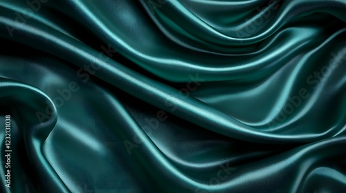 Emerald Silk Drape: Luxurious teal silk fabric gracefully draped, creating elegant folds and ripples. The rich texture and deep color evoke a sense of sophistication and opulence.