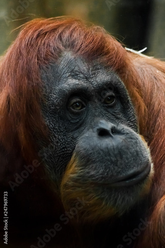 Emotion bewilderment. Smart and kind face of red orangutan close up.