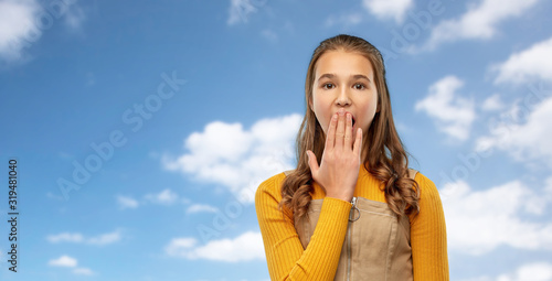 emotion, expression and people concept - scared or yawning teenage girl closing her mouth by hand over blue sky and clouds background