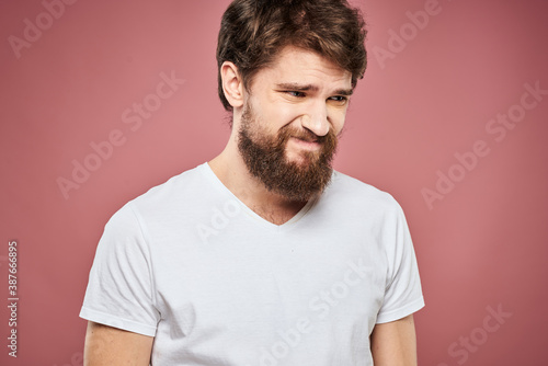 man, male, adult, background, person, young, face, portrait, guy, photogenic, white, studio, casual attire, discontent, people, attractive, hair, expression, beard, bearded, concept, trendy, shirt, horizontal, student, indoor, coiffure, gesture, shot, facial, emotion, serious, displeased, red, hipster, human, stylish, head, lifestyle, model, men at work, 1, fashionable, problem, crazy, posing, feeling, emotional