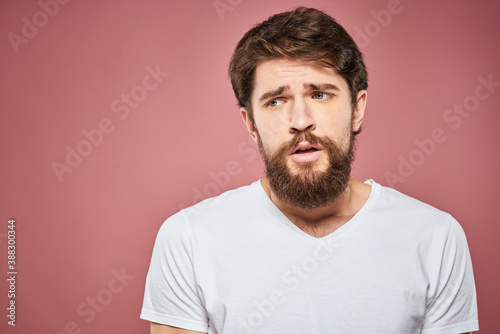 man, male, adult, background, person, young, face, portrait, guy, photogenic, white, studio, casual attire, discontent, people, attractive, hair, expression, beard, bearded, concept, trendy, shirt, horizontal, student, indoor, coiffure, gesture, shot, facial, emotion, serious, displeased, red, hipster, human, stylish, head, lifestyle, model, men at work, 1, fashionable, problem, crazy, posing, feeling, emotional