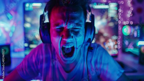 Emotional gamer for computer games and game consoles sat in front of the screen. Player with stormy emotions. Neon colors. Young man screaming in euphoria