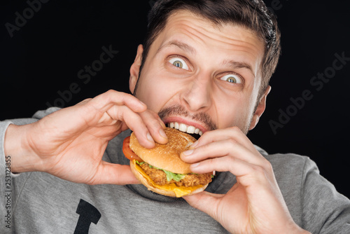 emotional man eating tasty chicken burger while looking at camera isolated on black