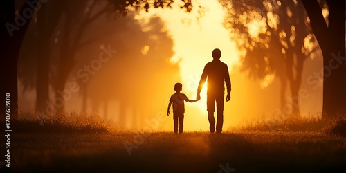 Emotional Value concept. A person and child walk hand in hand during a golden sunset in a serene landscape.