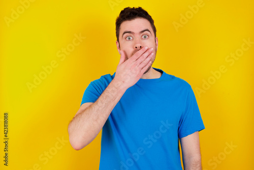 Emotional young handsome caucasian man wearing blue t-shirt against yellow background gasps from astonishment, covers opened mouth with palm, looks shocked at camera. Reaction concept